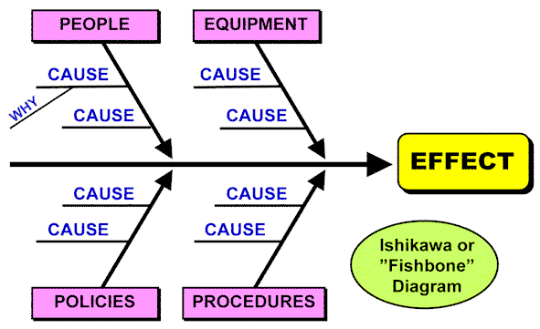 Cause/Effect Analysis 31 December 2004 This graphical “bottom-up” predictive or diagnostic analytical tool is used to explore the root causes or factors that contribute to positive or negative effects or outcomes. The categories can include environment, budget, time, and any other resource factors pertinent to the end effect. The most typical form is the Ishikawa or Fishbone Diagram. One should particularly seek out the Root Causes by continually asking "Why?"