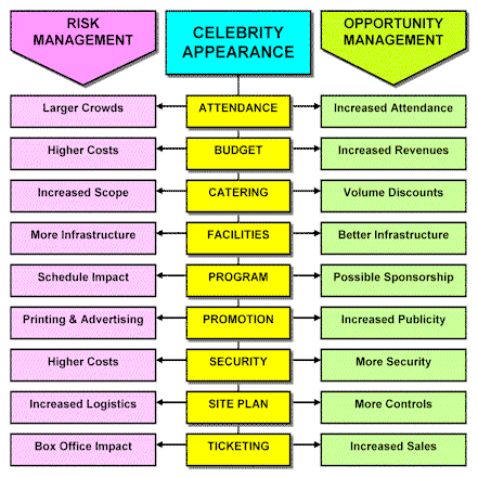 Risk and opportunity represent the two-sided coin of "chance". Risk management, traditionally, seeks to minimize negative outcomes, whereas opportunity management seeks to take advantage of possibilities that enhance positive outcomes. The identification of the potential impacts and potential benefits of a particular decision or change allows the event organizer (and risk manager) to properly prepare for the risks and successfully develop the gains. This "downsides" / "upsides" perspective (similar to a Change Impact or Cost/Benefit analysis) also facilitates change management and the ability to justify the decisions made.