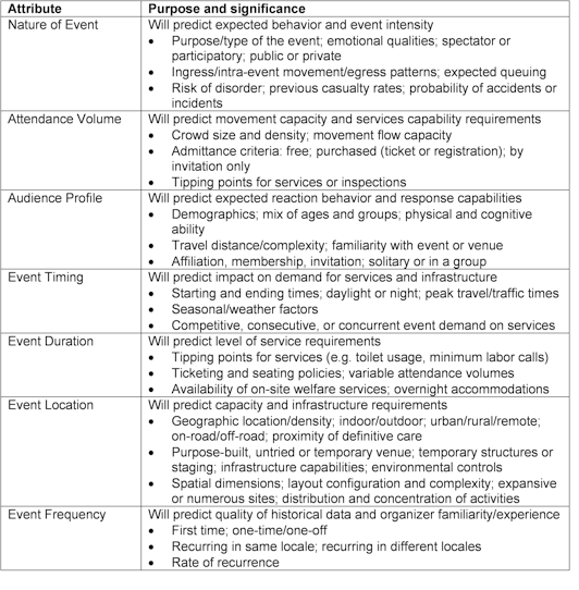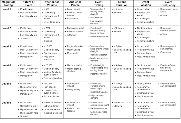 Certain attributes have been identified in the Life Safety Code (NFPA, 2000) and event safety standards (HSE, 1999; Standards South Africa, 2004), and the eSAFE system identifies four attribute sort fields. A set of suggested attributes and their significance are shown in Table 4 and an example of a paradigm-style classification matrix with suggested metrics (not yet quantified) is shown in Figure 3 in order to provide an illustration of the shorthand-descriptor potential of such an event magnitude rating system. Many of these factors are included in a risk analysis to measure probability and severity, yet other attributes also assessed in a risk analysis may be pertinent, including the nature of the event organization (e.g. sufficiency and competency of human resources, volunteer or paid professional staff, presence or absence of policies and procedures, etc.), the event host (e.g. corporate, non-profit, government; suggesting presence or absence of rituals or restrictions), or the event attractions (e.g. hazardous or high-demand activities, food and alcohol service, special effects, etc.). Given the broad spectrum of possible attributes and the uniqueness of even long-standing recurring events, a single rating matrix cannot anticipate every aspect of an event and would not be a substitute for a proper risk analysis, but could provide a starting point for risk assessment that identifies design and response guidance tipping points. In addition to the risk management potential, these attributes and tipping points may serve to guide event permission, funding, and sponsorship decisions for major stakeholders (O’Toole, 2006).