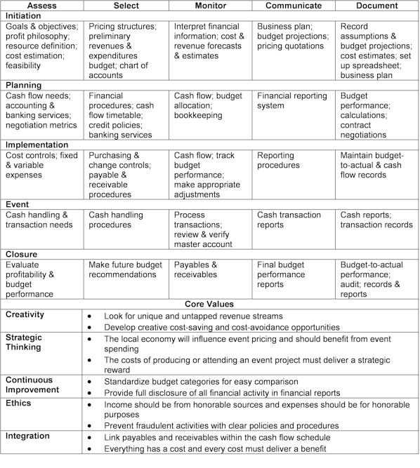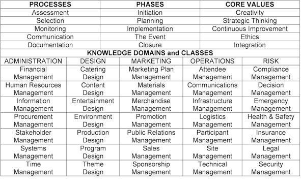 The goal of the International EMBOK Model is to serve as a resource for current and future industry practitioners, curriculum developers, and competency credentialing organizations to ensure the profession of events management achieves credibility through continuous improvement. As illustrated in Table 1, the framework presents five Processes, five Phases, five Core Values, and five Knowledge Domains that encompass thirty-five functional areas, referred to as Classes. This framework of categories facilitates study, analysis, and knowledge management, as well as providing a structure for systematically and consistently approaching the scope of responsibilities and competencies necessary to bring legitimacy and gravitas to this profession.