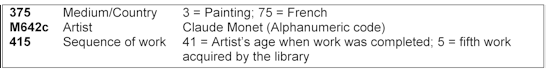 Another example, as illustrated in Figure 2, is the University of New Mexico Fine Arts Slide Library’s three line code used to classify its inventory of slides used in art history classes for its filing and retrieval system, which allows users to search for items by medium, nationality, artist, or the stage within an artist’s body of work depending on the user’s need. It also allows acquisitions to be integrated into the slide collection with a minimum of expertise in the field, needing only identification of the artist, date of the work, and medium in order to properly position it within the classification system. This simple alphanumeric code becomes a shorthand descriptor for users.