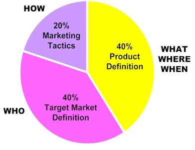 The 40/40/20 model, typical in direct marketing, suggests that 40% of the plan's success will be dependant upon product definition, 40% on target market definition, and 20% on the methods used to promote the product to the target market.