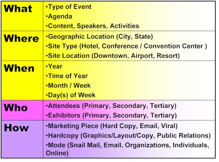 Maniaci uses these as categories to facilitate brainstorming sessions during which the typical needs assessment questions are considered (the 5 W’s). The 40/40/20 model helps participants see the interrelationship between these categories, as well as see the event as a product.